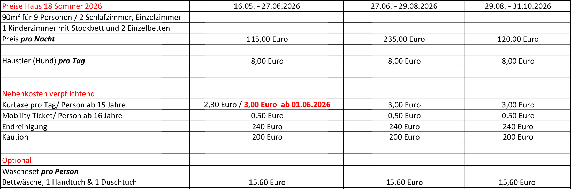 Die Mietpreise verstehen sich inkl. Hallenbad- und Saunabenutzung im Rezeptionsgebäude und Parkplatzbenutzung.